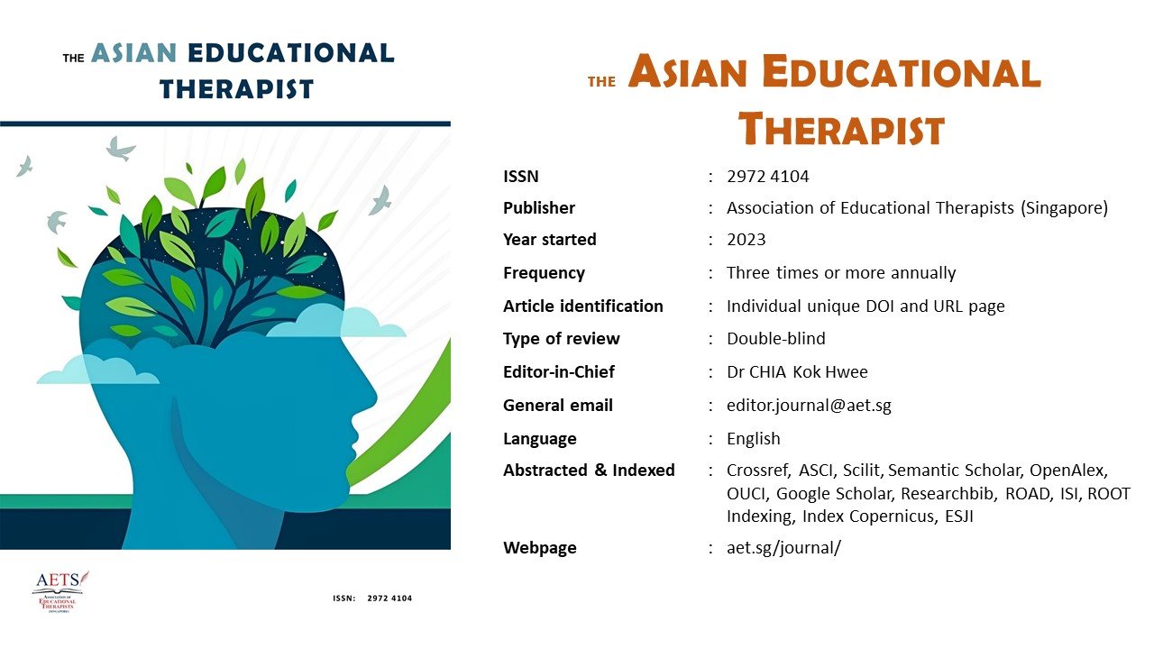 The Asian Educational Therapist publishes double-anonymised peer-reviewed, articles in an open access format. The Journal is an international, peer-reviewed journal dedicated to advancing the science, practice, and professional development of educational therapy and allied intervention disciplines.